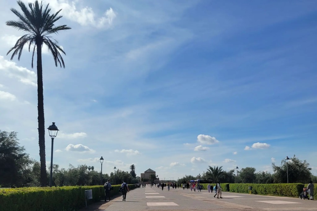 Stand at the Koutoubia Mosque minaret. Face Avenue Mohammed V. Walk west along the avenue. You reach the main gates on your right after three to five minutes.